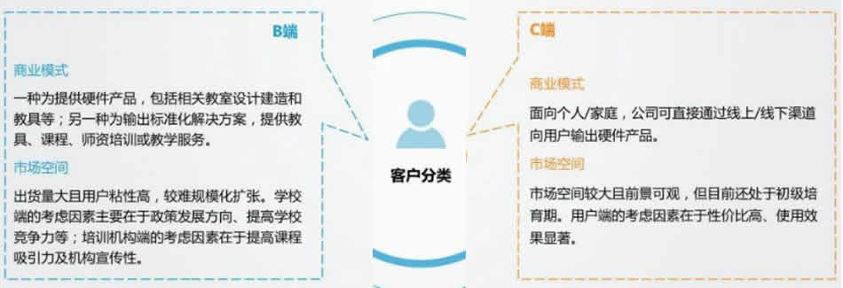 由于教育機(jī)器人涉及教育內(nèi)容的專業(yè)性等眾多因素,因此眾多公司均從針對(duì)學(xué)校及培訓(xùn)機(jī)構(gòu)的產(chǎn)品開始做起,然后再逐漸拓展C端市 場(chǎng)。一方面,從B端切入可以讓學(xué);蚺嘤(xùn)機(jī)構(gòu)做背書,幫助企業(yè)提G影響力,積累潛在客戶;另一方面,擴(kuò)展C端業(yè)務(wù)不僅能解決 TO B模式的客單價(jià)彳氐且難規(guī)模擴(kuò)張的問題,同時(shí)能通過B端引流,降低TO C模式的G獲客成本。