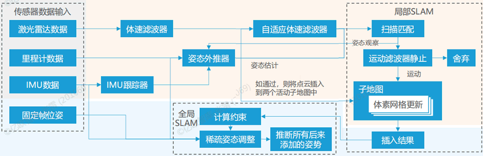 以谷歌開發(fā)的二維SLAM算法Cartographer為例:算法在前端完成占據(jù)柵格地圖的構(gòu)建,得出激光雷達掃描幀的佳位姿后,將掃描幀插入到子地圖中,得到局部優(yōu)化的子地圖并記錄位姿;后端根據(jù)掃描幀間的位姿關(guān)系進行全局的地圖優(yōu)化,得出閉環(huán)掃描幀在全局地圖中的佳位姿。